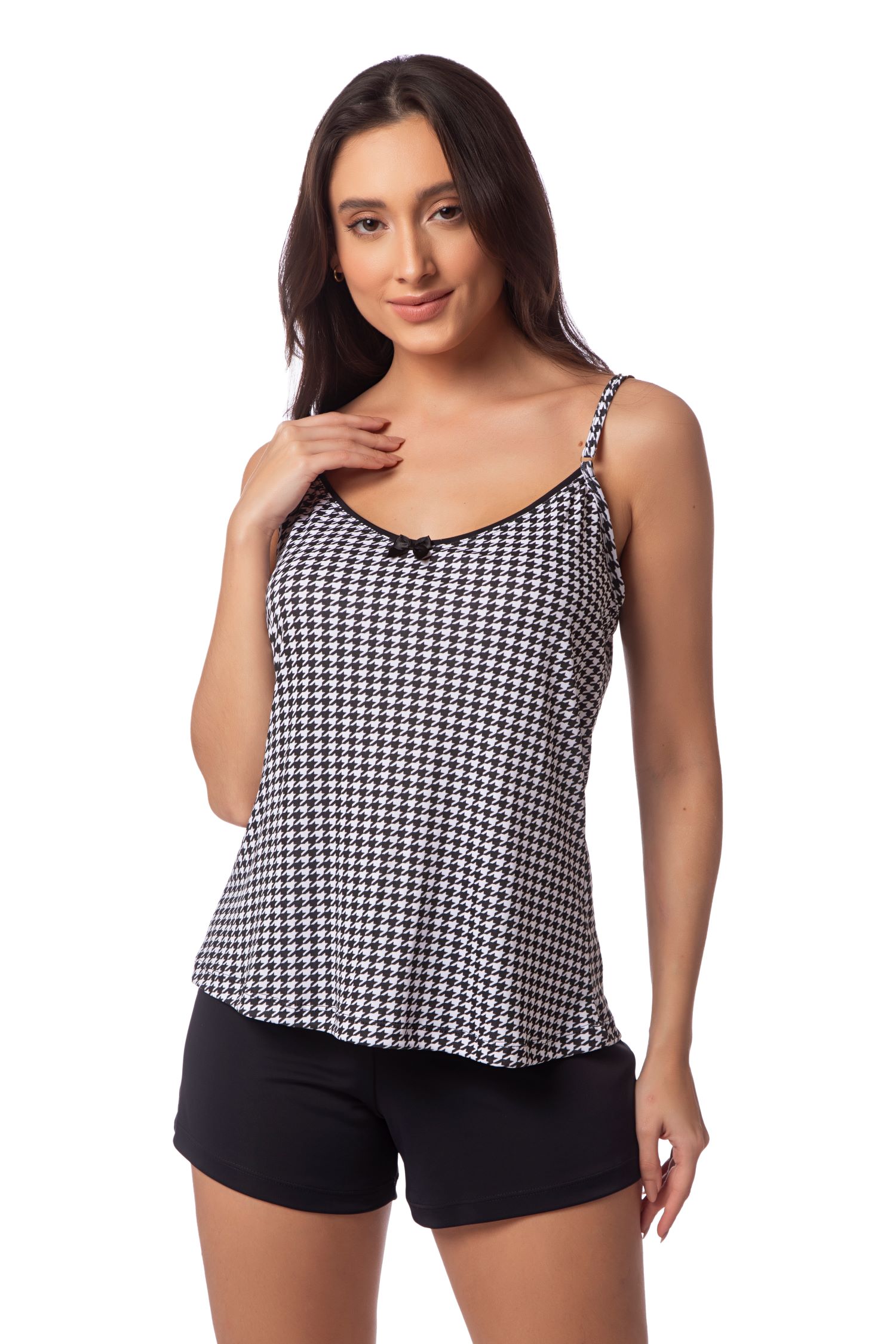 Baby doll básico, de alças, com blusa de padronagem clássica pied-de-poule (pronuncia-se piê de pul) e short liso de comprimento confortável. Pied-de-poule, em francês, significa ?pé de galinha?, isso porque o desenho da estampa lembra o formato do pé dessa ave. É uma padronagem clássica muito usada no inverno e que, nesta estação migrou para o verão em versões coloridas. Disponível em 2 opções de cores.